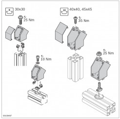 - соединители 45° 40x40 и 45x45 с центрирующими языками предназначены для простого позиционирования (для установки в пазу профиля центрирующие язычки можно просто отломать)